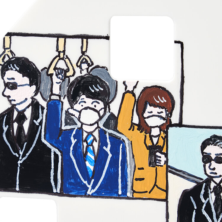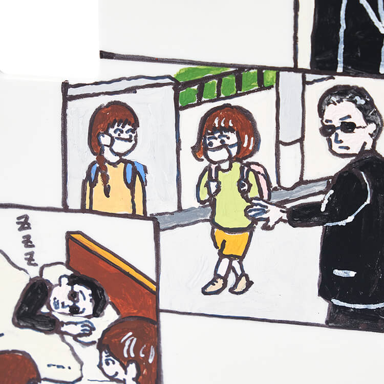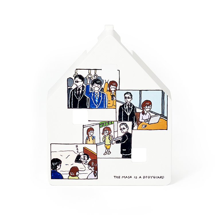 コロナ禍当初は玄関を出てからマスクを忘れていることに気がつくことがよくありました。そんなマスクも今やすっかり必需品として定着。マスクは外出時にずっとそばで守ってくれている、ということからボディガードという存在を思い浮かべました。外では頑張ってくれているボディガードも家に帰れば休まる場所「マスクノイエ」が必要。守ってくれている姿と休んでいる姿をマスクに感謝を込めてマンガで表現しました。
