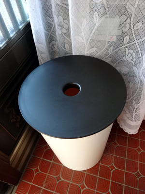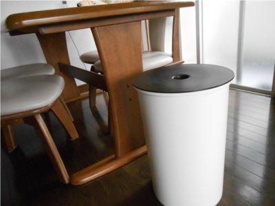 このスツール、横に並べた屑入れと比べて見て!かなり大きいって事がわかるよね!